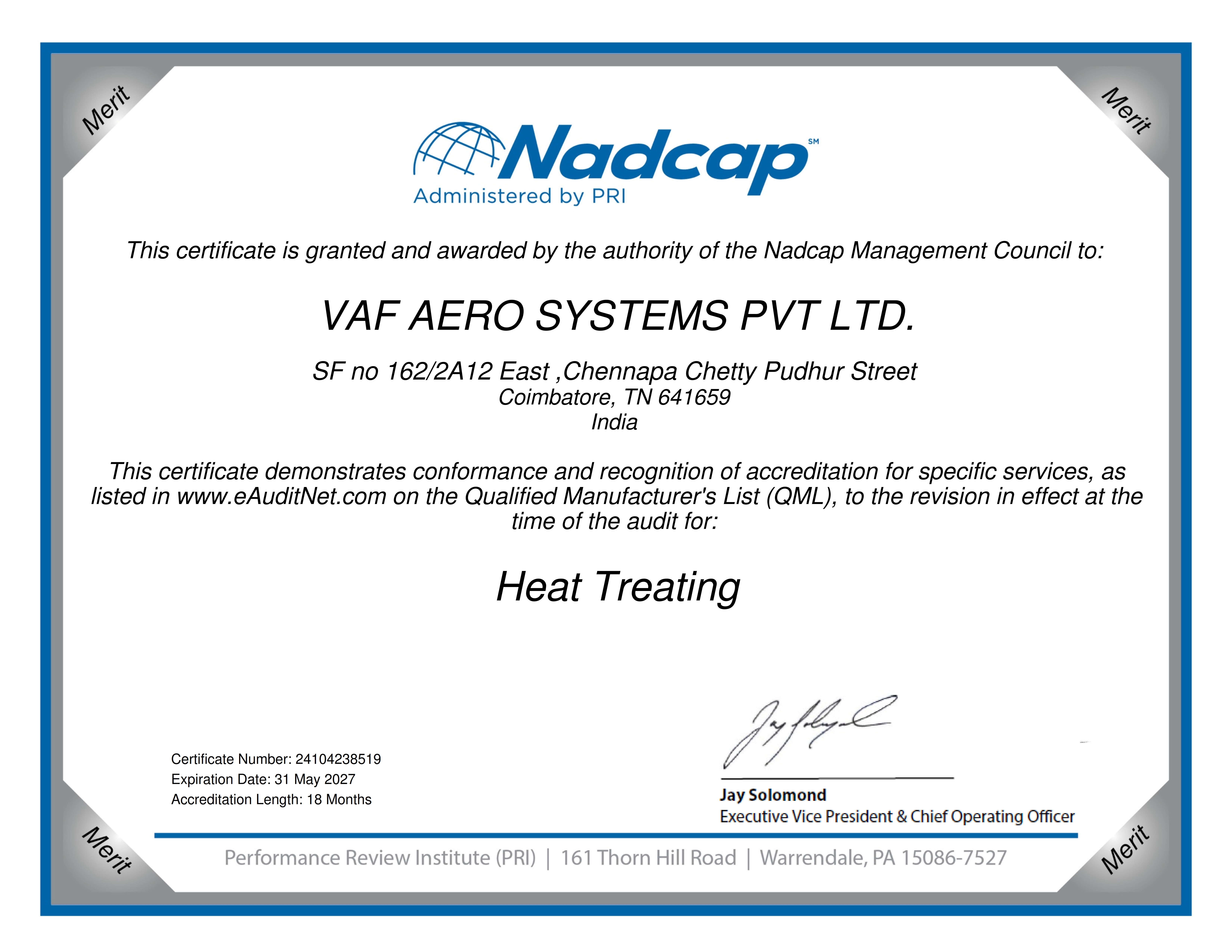 Certificate Nadcap (Aerospace) Heat Treating