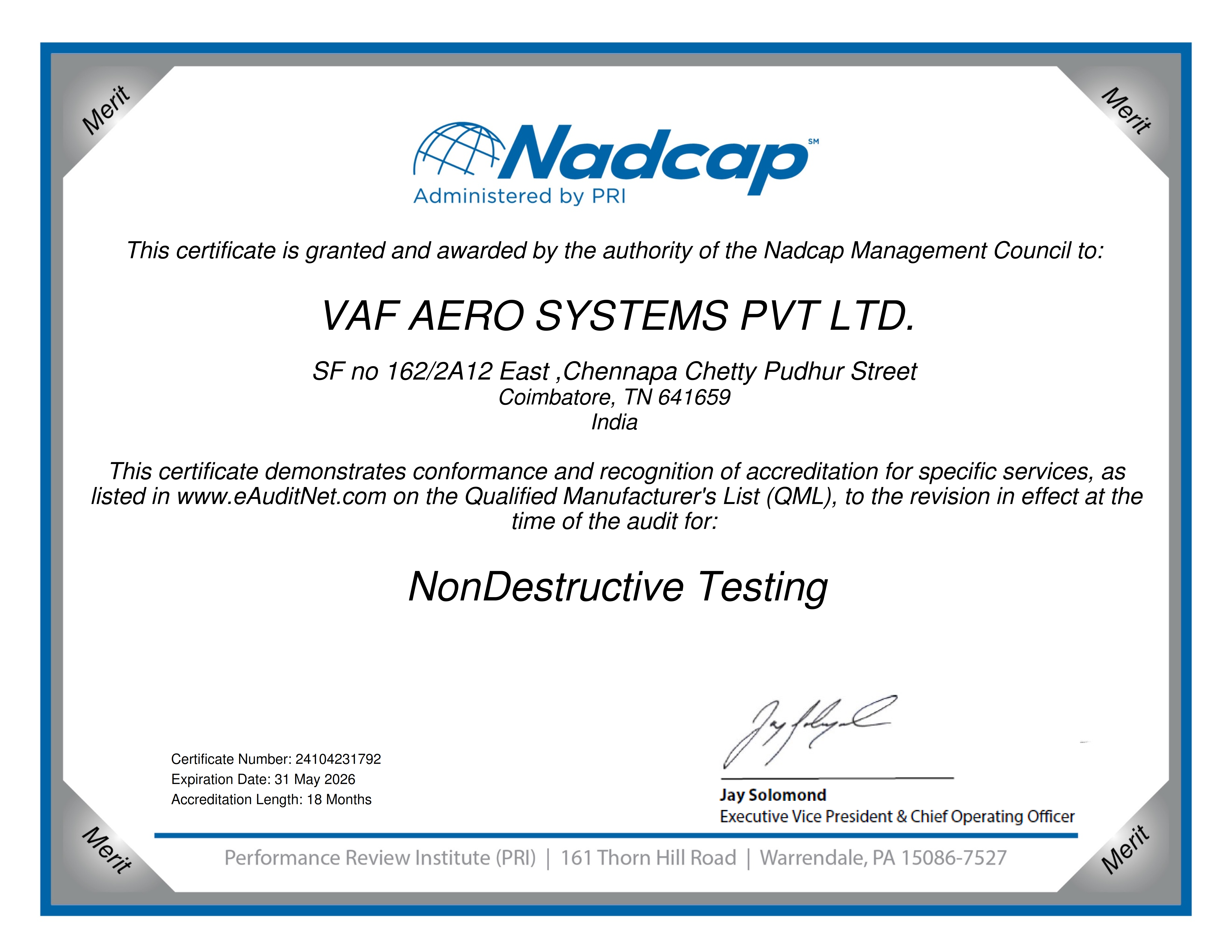 NADCAP Certification - NonDestructive Testing - VAF