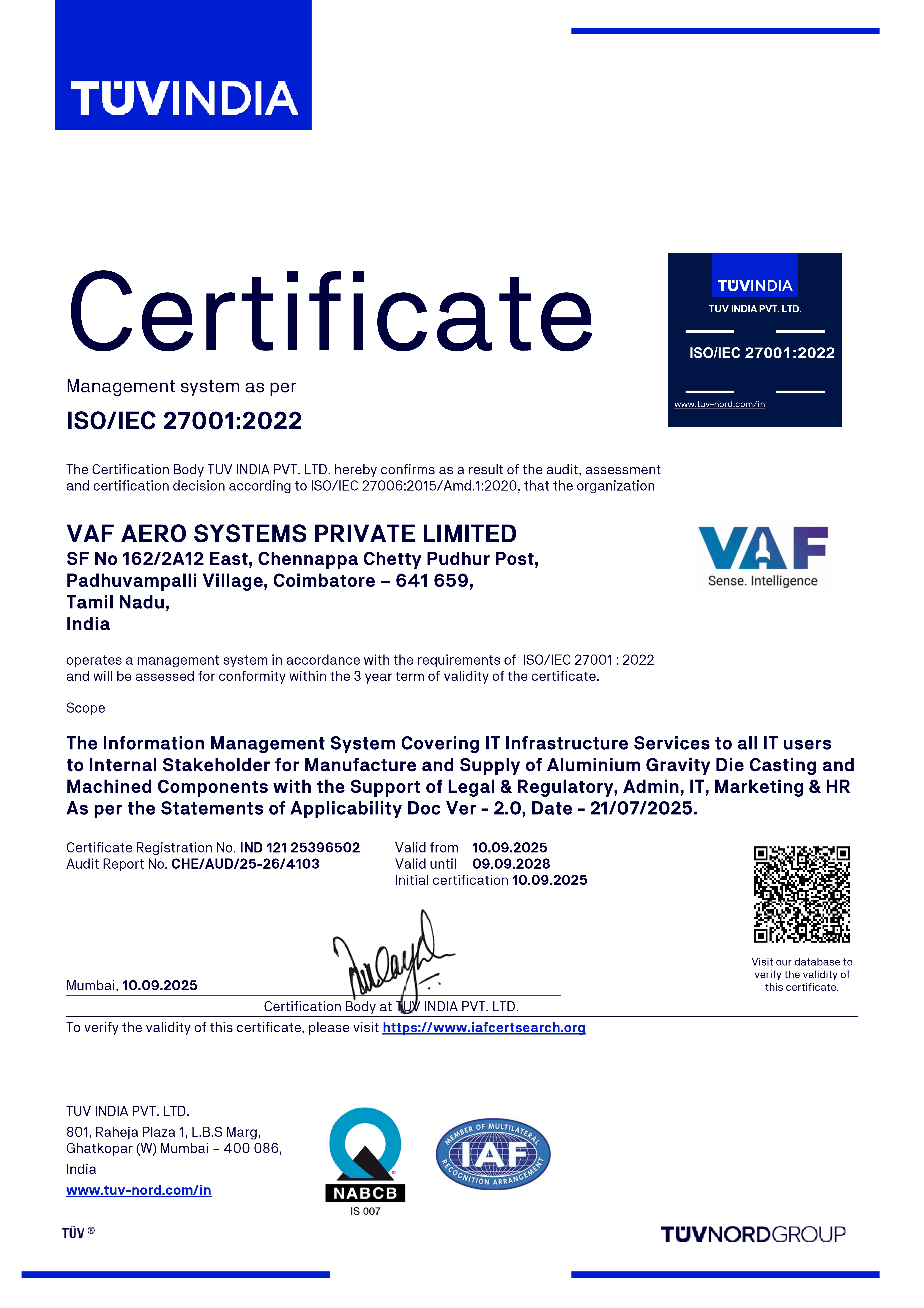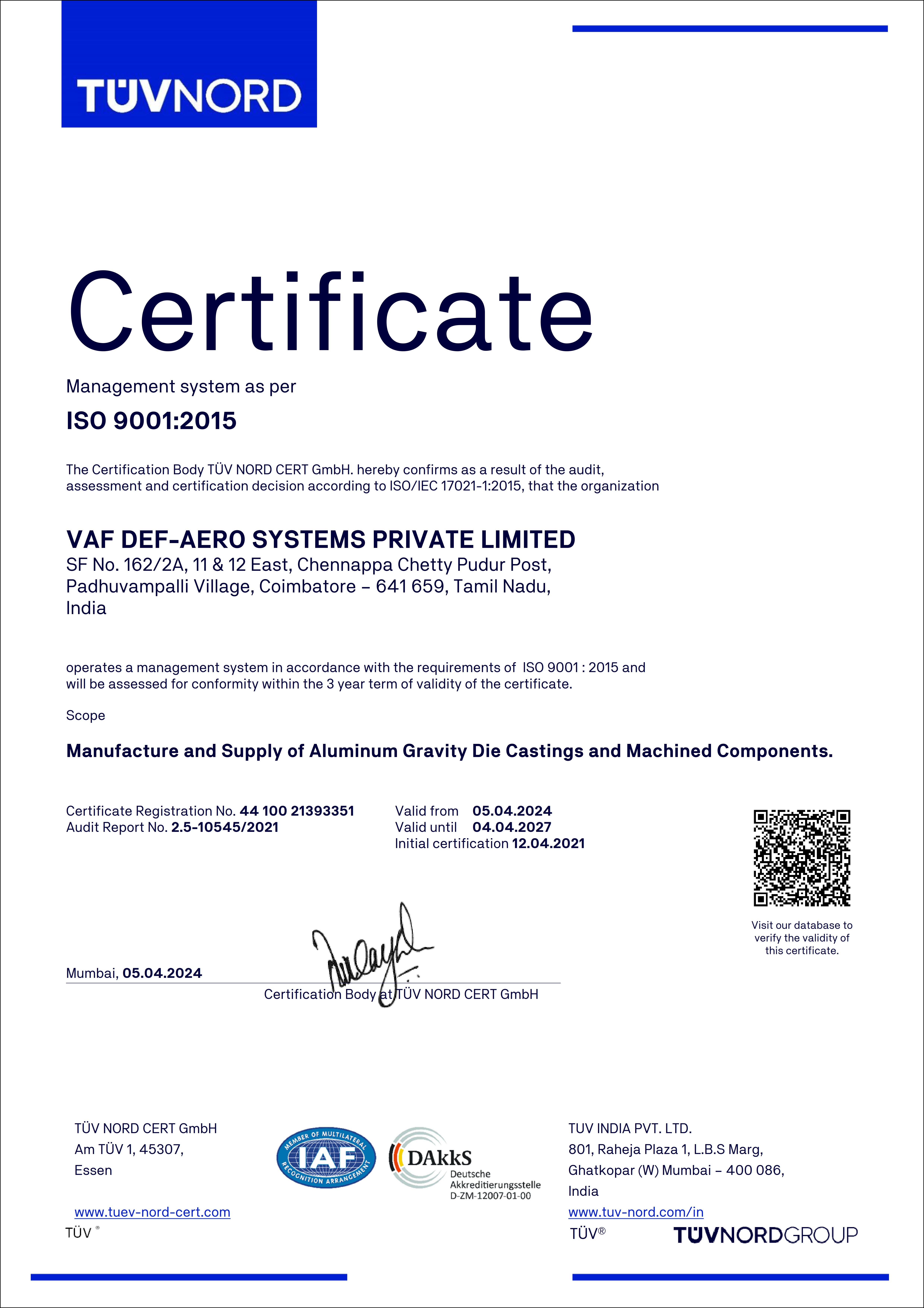 ISO 9001 - 2015 Certification - VAF