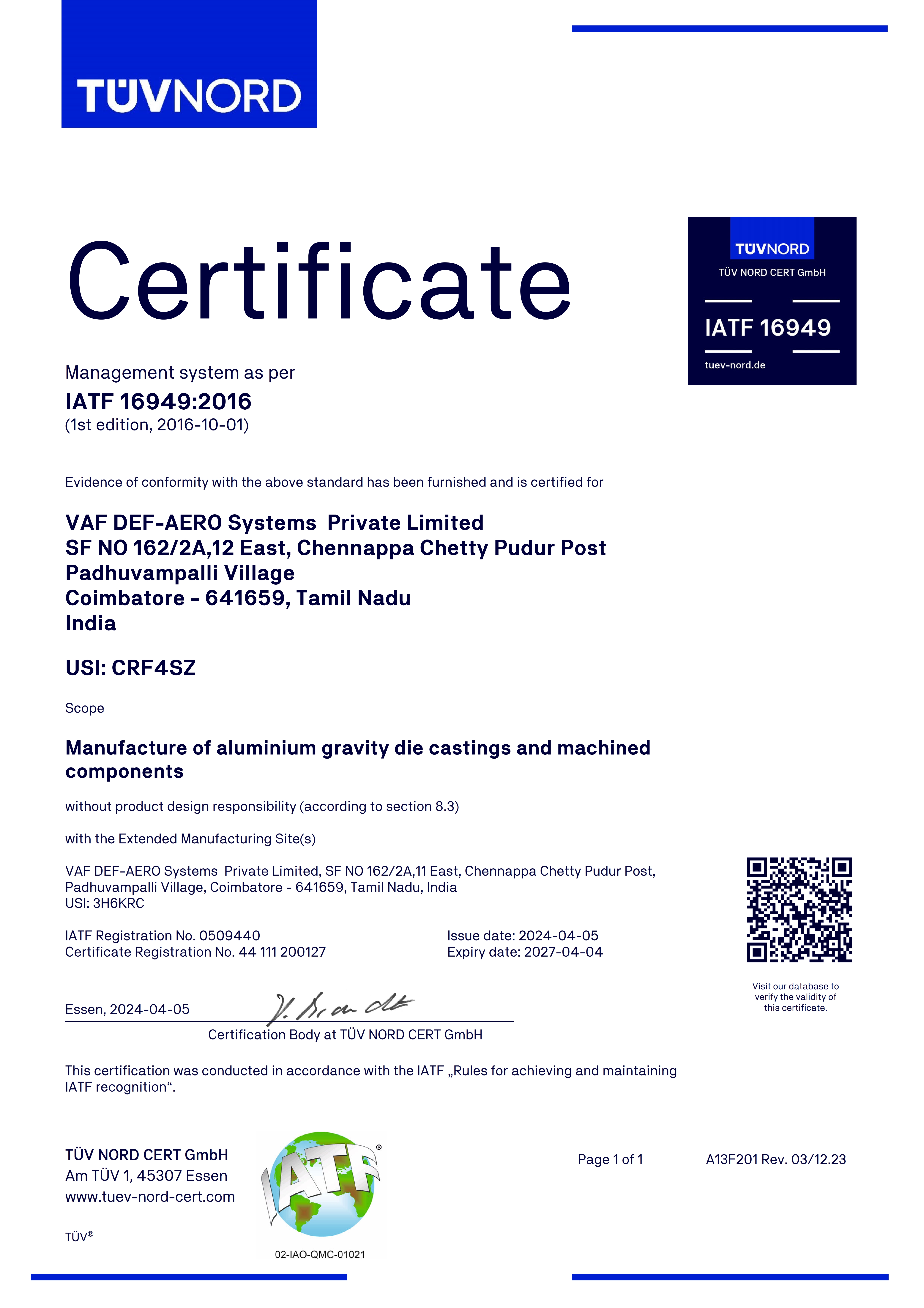 IATF 16949 - 2016 Certification - VAF